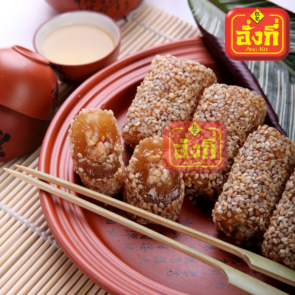 ขนมคอหงส์ เคลือบงา มีถั่วตัดเป็นไส้ด้านใน ทานคู่กับน้ำชา